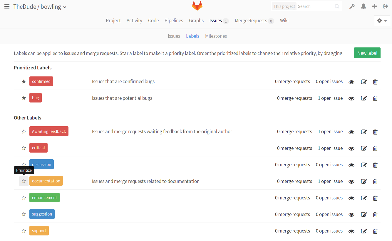 To prioritize labels, navigate to your project's Issues > Labels and click on the star icon next to them to put them in the priority list. Click on the star icon again to remove them from the list.